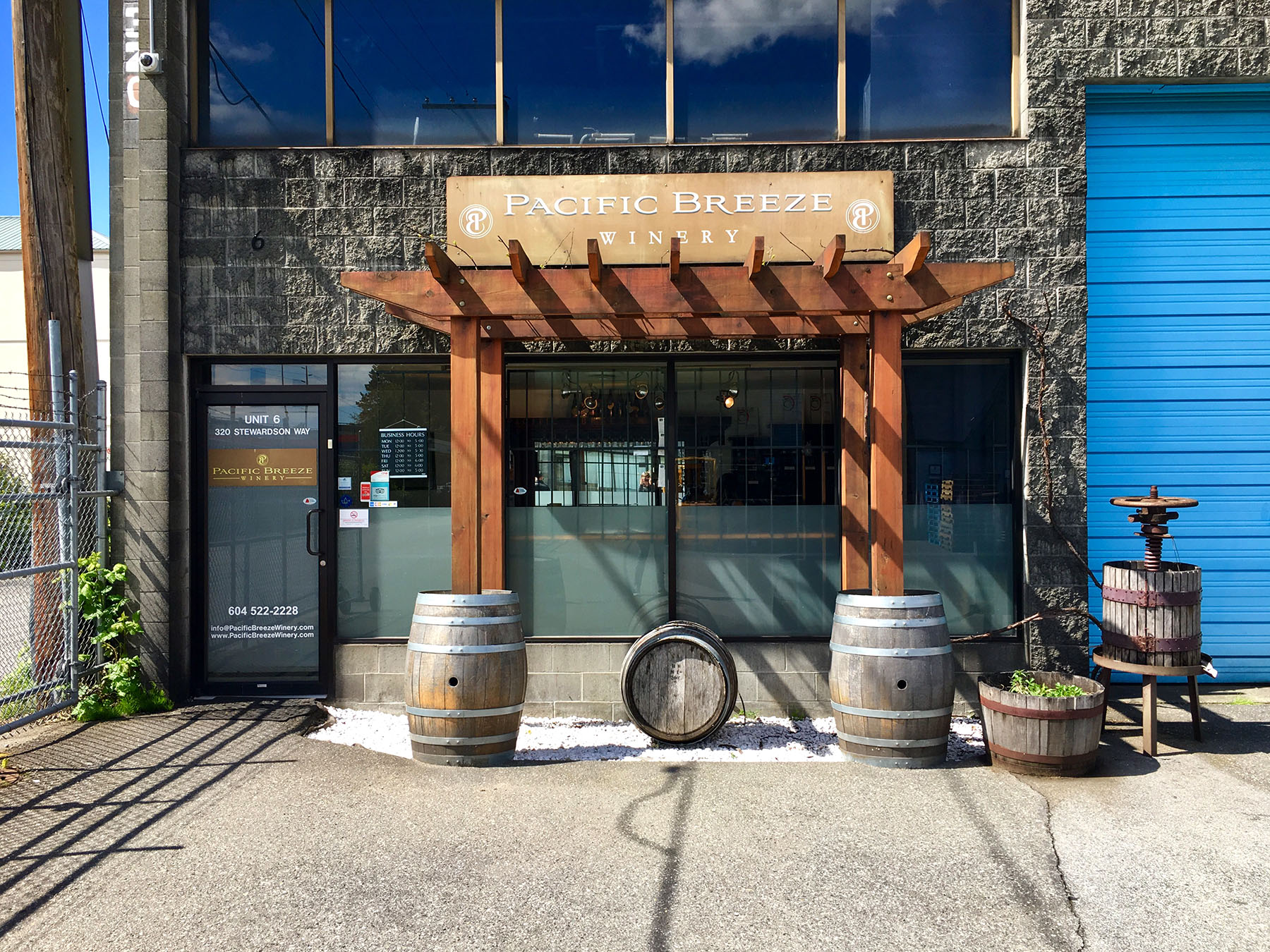 Pacific Breeze Winery was founded in 2005 by Maurice Hamilton and Frank Gregus who met at a wine club in Coquitlam; together they have more than 50 years combined experience producing wine in their own garages and basements. Their business model was inspired by the many garagiste wineries in Woodinville, Washington: “[they] gave me the idea [that I didn’t] have to grow grapes to have a winery. So that was really the a-hah moment, the revelation that, wait a minute, I can do this” recalls Maurice Hamilton.[1] Pacific Breeze Winery released their first vintage in March 2007.